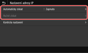 Normálně je nastaveno na [DHCP]. Pokud je však [DHCP] nastaveno v prostředí, kde nelze používat protokol DHCP, bude zařízení nadále potvrzovat automatické získávání v síti, což vytváří zbytečnou komunikaci. Když nepoužíváte protokol DHCP, nastavte tuto položku na hodnotu [Vypnuto].