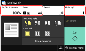 Ustaw współczynnik kopiowania, papier i liczbę kopii.