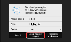 Gdy oryginał zostanie umieszczony na płycie szklanej i skopiowany przy użyciu funkcji kopiowania dwustronnego lub N na 1, zostanie wyświetlony ekran skanowania następnego oryginału.