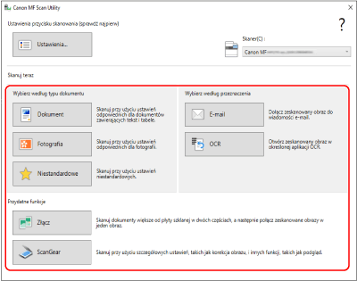 Wybierz sterownik skanera (ScanGear MF lub WIA) urządzenia, a następnie skonfiguruj ustawienia skanowania.
