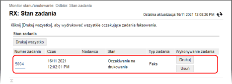 Gdy klikniesz na numerze zadania, wyświetlony zostanie ekran [Szczegóły zadania]. Możesz wyświetlić czas odbioru i liczbę stron, a także wyświetlić podgląd faksu.