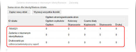 Gdy włączone jest zarządzanie identyfikatorami wydziałów, możesz zobaczyć liczbę stron wydrukowanych i skopiowanych dla każdego identyfikatora wydziału.