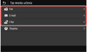 Na uloženie e-mailových adries (e-mail, I-Fax) a faxových čísel môžete použiť nasledujúce postupy: Ukladanie miest určenia priamym zadaním informácií o nich.