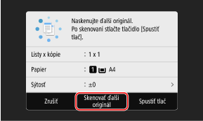 Po položení originálu na predlohové sklo a po jeho obojstrannom skopírovaní či kopírovaní v režime N na 1 sa zobrazí obrazovka s možnosťou skenovania ďalšieho originálu.