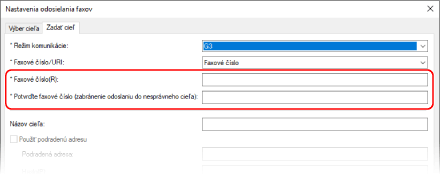 Ak je možné zadať údaje v časti [Potvrďte faxové číslo (zabránenie odoslaniu do nesprávneho cieľa)], zadajte rovnaké faxové číslo.