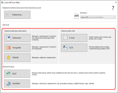 Kliknutím na položku [ScanGear] zobrazte ovládač ScanGear MF, a nakonfigurujte rozšírené nastavenie skenovania. Ďalšie informácie získate zobrazením pomocníka kliknutím na [
