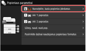 Jei daugiafunkciam dėklui visada naudojate tokį patį popierių, popieriaus formatą ir tipą galite užregistruoti. Taip nebus rodomas popieriaus parametrų ekranas, kurių jums nereikės konfigūruoti.