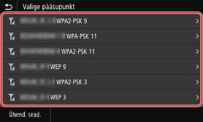 Otsige traadita kohtvõrgu marsruuter (pääsupunkt), millega soovite ühenduse luua, ja sisestage võrguvõti. Kui kasutate ühendamiseks pääsupunkti seadistusmeetodit, määratakse järgmised autentimis- ja krüptimismeetodid. WEP autentimismeetod: avatud süsteem WPA/WPA2 krüptimine: AES-CCMP või TKIP määratakse automaatselt vastavalt valitud traadita kohtvõrgu marsruuterile. Erineva autentimis- või krüptimismeetodi määramiseks kasutage ühendamisel käsitsi seadistusmeetodit. Ühenduse loomine traadita kohtvõrguga üksikasjade seadistamise teel (käsitsi seadistusmeetod) |