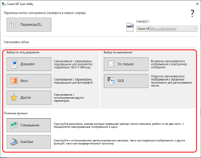 Выберите драйвер сканера (ScanGear MF или WIA) аппарата и настройте параметры сканирования.