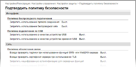 К политике безопасности для данного аппарата применяется содержимое, заданное на другом устройстве или в программном обеспечении. В связи с этим в политике могут быть элементы, которые отсутствуют в данном аппарате, однако они никак не сказываются на его настройках или операциях, которые он выполняет.