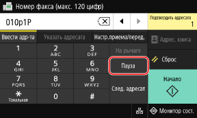 При отправке факса заграницу введите номер выхода на международную связь, код страны и номер факса адресата в указанной последовательности. Нажмите [Пауза] между номерами, чтобы добавить паузу.