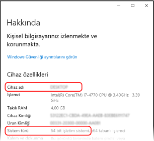 [Cihaz özellikleri] kısmında, bilgisayarın adını ve işletim sistemi sürümünü görüntüleyin.