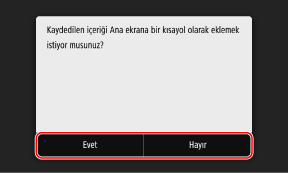 [Hayır] öğesini seçtiğinizde Favori Ayar kaydedilir ancak bir kısayol düğmesi eklenmez. [Ana Ekran] kısmına daha sonra bir kısayol düğmesi ekleyebilirsiniz.
