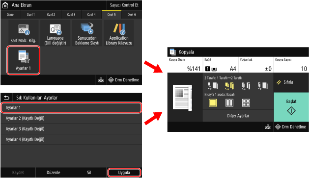 Kumanda panelindeki [Ana Ekran] kısmına eklenen kısayol düğmelerini ve her bir işlevin ekranını kullanarak hızlı işlem için kaydedilen ayarları çağırabilirsiniz. Ayrıca, ayarları gerektiği gibi çağırdıktan sonra da değiştirebilirsiniz.