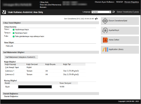 Buradan, bir işlevin durumunu ve günlüklerini, makinenin çalışma durumunu ve hata bilgilerini kontrol edebilirsiniz. Kullanımı ve Günlükleri Uzak Kullanıcı Arabirimi ile Kontrol Etme