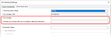 הזן את מספר הפקס בלשונית ה-[Enter Destination]. כאשר [Confirm Fax Number (Prevent Sending to Wrong Destination)] ניתן להזנה, הזן את אותו מספר פקס.