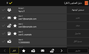 يتم عرض هذه العناصر على الجانب الأيمن من الشاشة. اضغط لتسجيل أو تحرير أو حذف إحدى الوجهات، أو لتحديد الوجهة لإرسال البيانات أو حفظها.