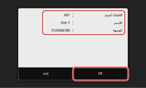 عند تحديد الوجهات على شاشة المسح الضوئي أو الفاكس، بالإضافة إلى استخدام قائمة الوجهة، يمكنك أيضًا إدخال رقم الاتصال المرمز لتحديد الوجهة.