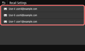 در زبانه [Specify Destination] صفحه اسکن یا فاکس، [Recall Settings] را فشار دهید.