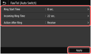 وقتی [Fax/Tel (Auto Switch)] برای تشخیص تماس ورودی فاکس فعال باشد، میتوانید تنظیماتی مثل زمان زنگ خوردن را نیز پیکربندی کنید.