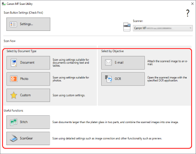 روی [ScanGear] کلیک کنید تا ScanGear MF نمایش یابد و تنظیمات اسکن پیشرفته را پیکربندی کنید. برای کسب اطلاعات بیشتر، برای نمایش راهنما روی [