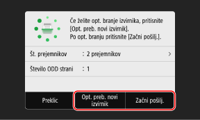 Če želite nadaljevati optično branje izvirnikov, jih položite na stekleno ploščo in pritisnite [Opt. preb. novi izvirnik].