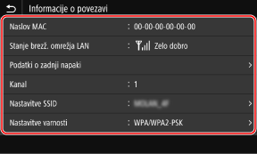 Poleg naslova MAC in podatkov o povezavi z brezžičnim omrežjem LAN, ko je naprava povezana z brezžičnim LAN-om, si lahko ogledate tudi varnostne nastavitve.
