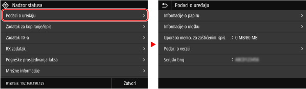 Dodirom naziva ili gumba stavke odabire se ta stavka. Prikazat će se odabrani zaslon ili će se pokrenuti odabrana funkcija.