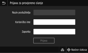 Kada je postavljeno slanje s provjerom autentičnosti (provjera autentičnosti LDAP poslužitelja), prilikom skeniranja i faksiranja prikazat će se zaslon za prijavu putem slanja s provjerom autentičnosti. Za prijavu upišite korisničko ime i lozinku kojima se upravlja putem LDAP poslužitelja.