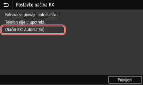 Kada se prikaže poruka [Postavke se konfiguriraju.], prikazat će se zaslon [Postavke načina RX].