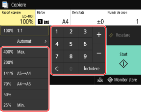 Raportul de copiere este setat automat, în funcție de formatul de hârtie utilizat la copiere.