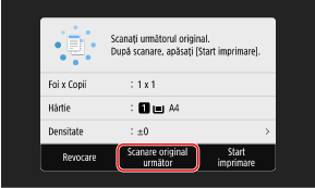 Când originalul este amplasat pe suprafața de scanare și copiat folosind copierea pe 2 fețe sau N pe 1, se afișează ecranul pentru scanarea originalului următor.