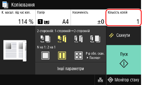 Натисніть [Кількість копій], за допомогою клавіш із цифрами введіть кількість копій і натисніть [Закрити].