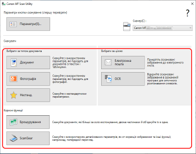Виберіть драйвер сканера (ScanGear MF або WIA) пристрою та налаштуйте параметри сканування.