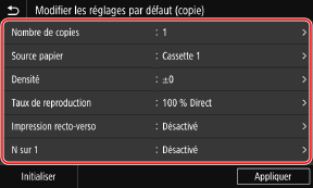 Vous pouvez également réinitialiser les paramètres aux paramètres définis ici en appuyant sur [Réinit.] sur n’importe quel écran de fonction.