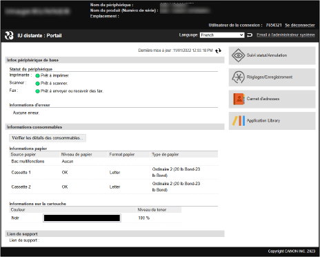 Lorsque vous vous connectez à l'interface utilisateur distante, la page Portail (page d'accueil de l'interface utilisateur distante) s'affiche. Depuis cette page, vous pouvez vérifier l'état d'utilisation de l'appareil, afficher diverses informations et changer les paramètres au moyen de boutons.