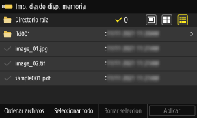 Inserte el dispositivo de memoria USB en la máquina, y en la pantalla [Inicio], pulse [Imp. desde disp. de mem.] para mostrar los archivos y carpetas del dispositivo de memoria USB.