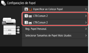 Por padrão, o tamanho do papel e o tipo da gaveta de papel são definidos como LTR e Comum 2. Ao colocar papel de tamanho ou tipo diferente, altere as configurações do papel.