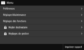 Modification de l'affichage de l'écranVous pouvez modifier l’affichage du panneau de commande, par exemple en changeant la langue et les unités d’affichage, ou en affichant ou en masquant les messages. [Réglages d'affichage] Vous pouvez inverser les couleurs de l'écran et régler la luminosité pour que l'écran soit plus facile à voir. [Accessibilité] Effacement automatique des paramètresPar défaut, si aucune opération n'est effectuée après un certain laps de temps, les paramètres configurés sur l'écran sont effacés et l'écran [Accueil] s'affiche. Vous pouvez modifier le délai d'effacement des paramètres et l'écran qui s'affiche ensuite. [Délai réinit. automatique] [Fonction après réinit. auto.] |