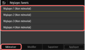 Utilisez le panneau de commande pour enregistrer les paramètres favoris. Vous ne pouvez pas enregistrer les paramètres favoris en utilisant l’interface utilisateur distante depuis un ordinateur.
