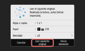 1 | Ponga el siguiente original sobre el cristal de copia y pulse [Leer siguiente original]. Se escanea el siguiente original y se muestra la misma pantalla. Repita este proceso hasta completar el escaneado de todos los originales. También puede pulsar [Densidad] y [Tipo de original] para cambiar los ajustes de cada original. Si el tamaño del original es diferente, puede faltar parte de la imagen o esta puede imprimirse a menor tamaño en el papel. |