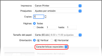 2 | En el menú emergente de opciones de impresión, seleccione [Características especiales]. Si no aparecen las opciones de impresión, haga clic en [Mostrar detalles] en el cuadro de diálogo de impresión. |