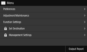 Changing the Screen DisplayYou can change the control panel display such as by changing the display language and units, and show or hide messages. [Display Settings] You can invert screen colors and adjust the brightness to make the screen easier to view. [Accessibility] Clearing the Settings AutomaticallyBy default, if no operations are performed after a certain period of time, the settings being configured on the screen are cleared, and the [Home] screen is displayed. You can change the time until the settings are cleared and the screen that is displayed after. [Auto Reset Time] [Function After Auto Reset] |