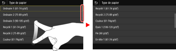 Déplacez le bout de votre doigt tout en touchant l'écran, et enlevez votre doigt lorsque vous avez atteint la position souhaitée. Vous pouvez faire défiler les listes et déplacer la zone que vous touchez à l'endroit souhaité.