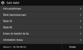 Cet écran s'affiche lorsque vous appuyez sur [Suivi statut] sur l'écran [Accueil] ainsi qu'à d'autres emplacements. Utilisez cet écran pour consulter les informations de la machine, l'utilisation et les journaux, les paramètres réseau ainsi que les informations concernant les erreurs. Écran [Suivi statut]