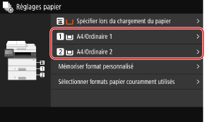 Par défaut, le format et le type de papier du tiroir à papier sont paramétrés comme A4 et Ordinaire 2. Lorsque du papier d'un format ou d'un type différent est chargé, modifiez les paramètres du papier.