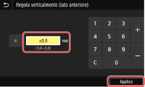 Specificare la direzione di regolazione con i tasti + e -, poi specificare la larghezza di regolazione in unità di 0,1 mm.