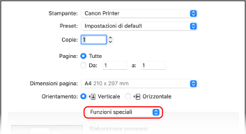 2 | Dal menu a comparsa delle opzioni di stampa, selezionare [Funzioni speciali]. Se non vengono visualizzate opzioni di stampa, fare clic su [Mostra dettagli] nella finestra di dialogo di stampa. |