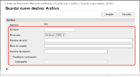 Al registrar las ubicaciones de almacenamiento de archivos (carpeta compartida o servidor FTP), seleccione [Archivo].