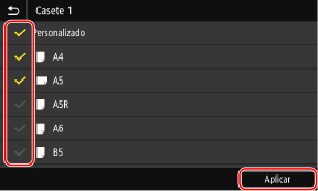 Los tamaños de papel cuyas casillas estén desmarcadas no aparecen en la pantalla de configuración del papel.